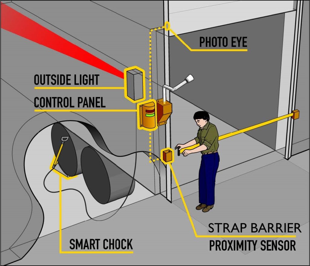 When supplied with optional proximity sensor, Strap Barrier can be integrated with Smart Chock. The Strap Barrier replaces the function of the dock door opening and closing when the facility operates with the loading dock doors open.