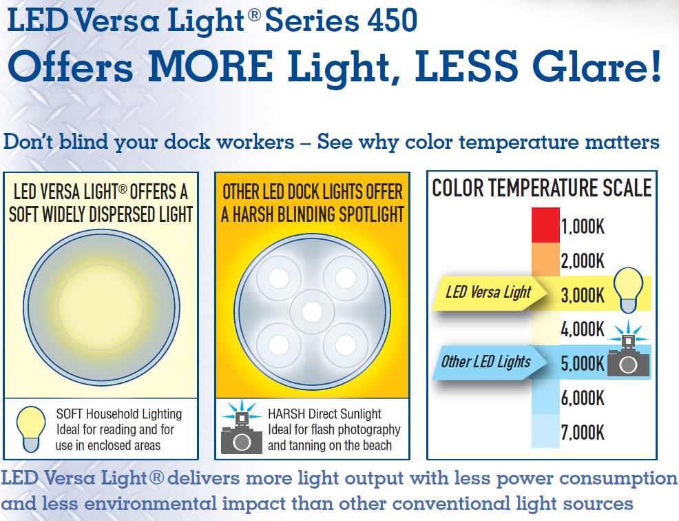 The LED Versa Light offers two critical features important for dock safety. First, the LED Versa Light fully illuminates the entire 8’x 53’ area of a trailer, front to back, side to side and top to bottom. In addition, we have engineered the LED light output with a color temperature ideal to working in an enclosed trailer, color temperature of 3100 and color rendering of 80. Other LED dock lights have a harsh spotlight effect, blinding dock workers and contributing to accidents and injuries. (See Color Temperature Chart)